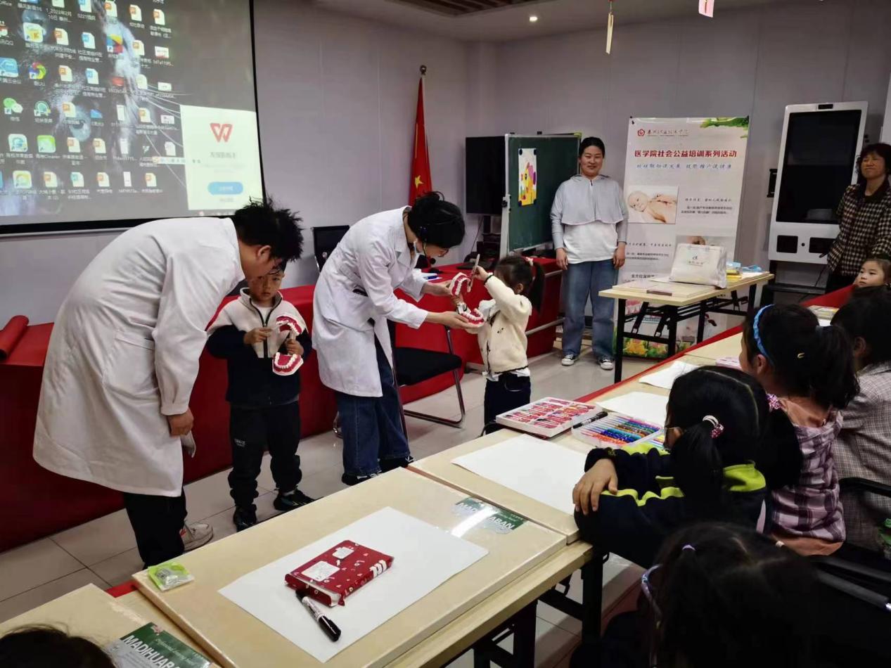 学生,为社区儿童讲解口腔卫生知识,现场指导小朋友们如何正确刷牙。并分发牙具及口腔护理健康宣教手册,让小朋友们将口腔健康知识带回家。