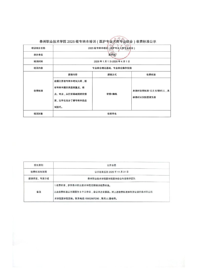 泰州职业技术学院2025级专转本培训(医护专业大类专业综合)收费标准公示