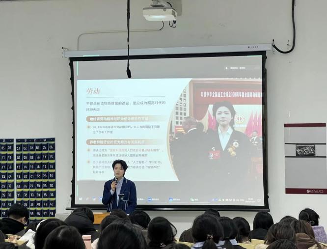 讲座伊始,徐昌成书记为现场及屏幕前的师生详细介绍了李楠楠护士长的先进事迹。作为90后养老护理行业的标杆人物,李楠楠深耕护理一线十三载,放弃大医院“铁饭碗”毅然投身养老事业,从基础的翻身擦背、吸痰通便等护理工作做起,用专业与爱心赢得“老人们的好孙女”这一亲切赞誉。徐书记强调,李楠楠所获的“全国五一巾帼标兵”“全国劳动模范”“江苏省劳动模范”等荣誉,以及连续两届当选全国人大代表的履职经历,无不彰显着新时代劳动者的责任与担当,为青年学子树立了鲜活的职业榜样。