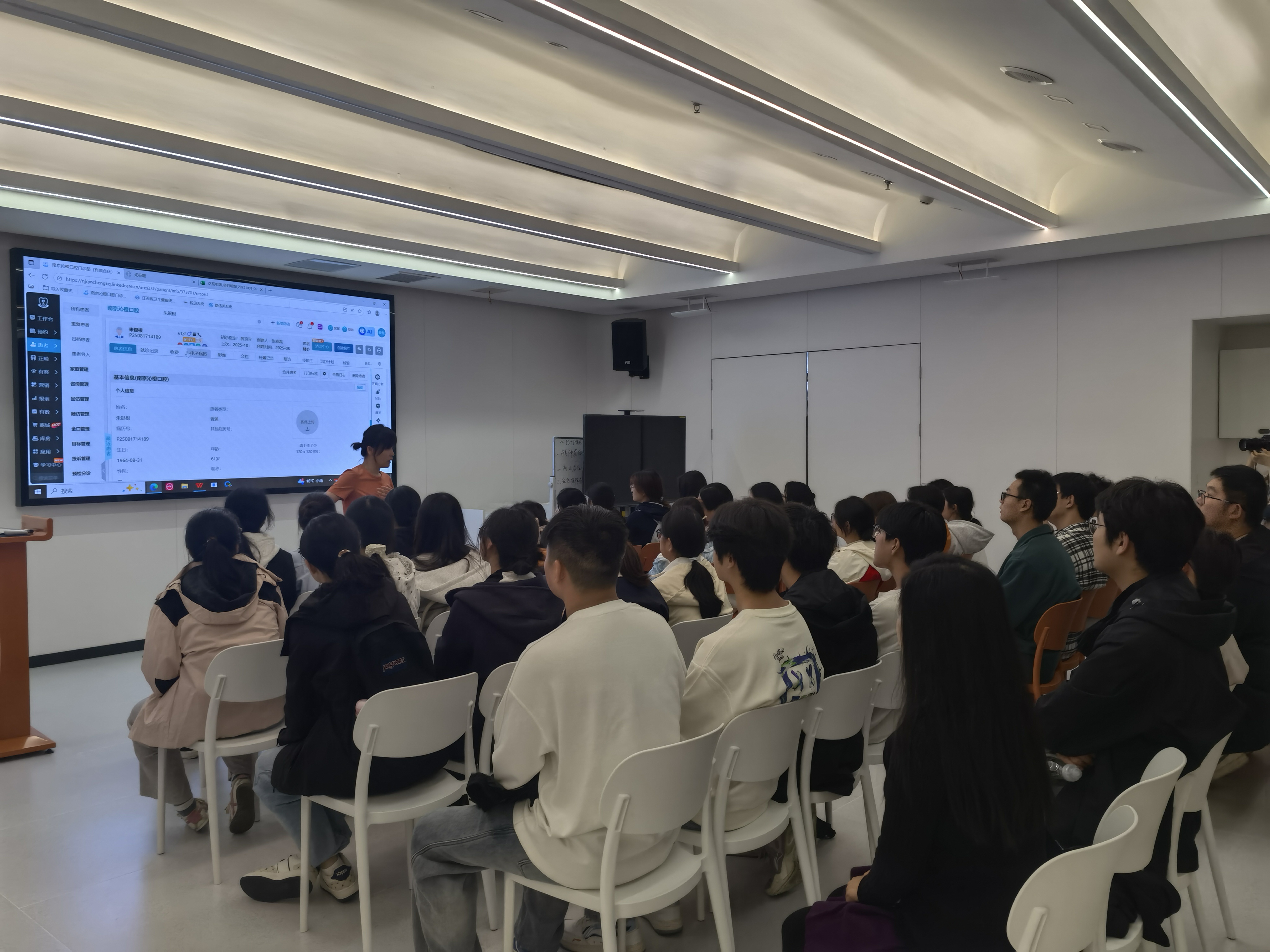 参观结束后,沁橙口腔监事张晓磊老师为同学们带来了一场内容丰富的专题讲座。他结合自身多年从业经验,从中国口腔医疗市场的发展现状与未来趋势出发,深入浅出地讲解了口腔医学人才的职业发展路径与核心能力要求,张老师特别强调,在“AI+医疗”与数字化技术快速发展的背景下,口腔医学人员必须持续学习新知识、掌握新技能。此外,他还就专业学习重点、职业生涯规划等学生关心的问题进行了细致解答,并鼓励同学们在校期间夯实理论基础、苦练实操本领,同时注重沟通能力与职业素养的培养,为成长为优秀行业人才做好充分准备。